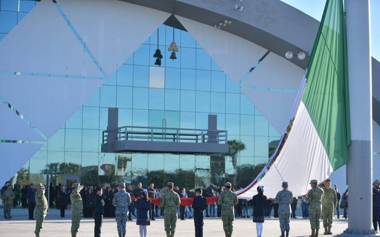 Ciudad Acuña, Coahuila. 05 de febrero de 2026.- El Gobierno Municipal de Acuña llevó a cabo la ceremonia cívica conmemorativa del 109 aniversario de la Promulgación de la Constitución Política de los Estados Unidos Mexicanos, con izamiento de bandera y honores a los símbolos patrios en el patio central de la Presidencia Municipal.