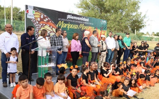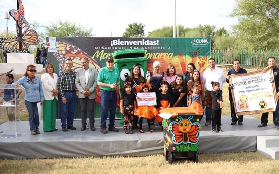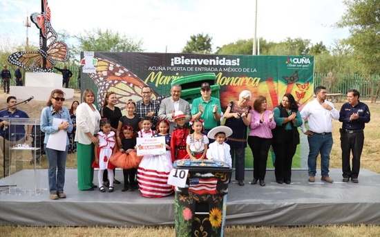 Acuña, Coah., 06 de oct. 2023.- En mañana llena de vida, estudiantes y maestros participaron en alegre festival de bienvenida a la Mariposa Monarca, con jornada artístico cultural, la plantación 450 bugambilias en jardín polinizador, la develación de monumento a la monarca y premiación de la convocatoria Pinta tu Contenedor.