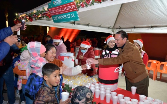En dos áreas de la macroplaza fueron colocados estratégicamente toldos con atención del personal de dependencias municipales, quienes ofrecieron a las familias bolos, bebidas calientes y pan.