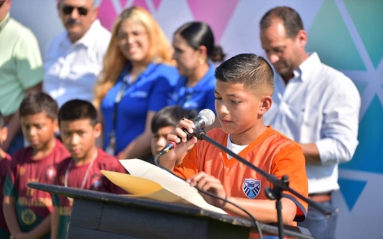 Reunidos en la cancha miembros de equipos infantiles de fútbol, y en su representación el adolescente Carlos Jared Juárez, quien manifestó que, cuando las personas trabajan con un mismo fin, buscando el bienestar de la comunidad, los resultados no necesitan palabras.