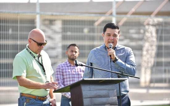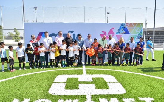 Acuña, Coah., 23 de junio de 2023.- Cuando se suman esfuerzos de sociedad y gobierno se pueden realizar grandes obras y grandes proyectos, resaltó el alcalde Emilio de Hoyos Montemayor al presidir la entrega de cancha de fútbol de pasto sintético en el Polideportivo La Fe.