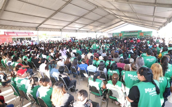 Piedras Negras, Coahuila de Zaragoza; a 23 de marzo de 2026.- Desde Piedras Negras y para todo el Estado, acompañado por alcaldesas y alcaldes de la entidad, el gobernador Manolo Jiménez Salinas detonó el programa “Con Obras Sociales a Pasos de Gigante” que, para este 2026, tiene una bolsa histórica de más de dos mil millones de pesos para acciones de pavimentación, recarpeteo, electrificación, agua, drenaje, techos, cuartos adicionales, entre otras, para las colonias, barrios y ejidos de todo Coahuila.
