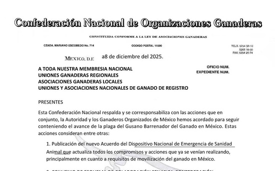 La Confederación Nacional de Organizaciones Ganaderas (CNOG) informa a todas las Uniones y Asociaciones Ganaderas del país que, junto con SADER y SENASICA, se han acordado y puesto en marcha acciones estratégicas para contener la plaga del Gusano Barrenador del Ganado (GBG) y proteger la actividad ganadera nacional.