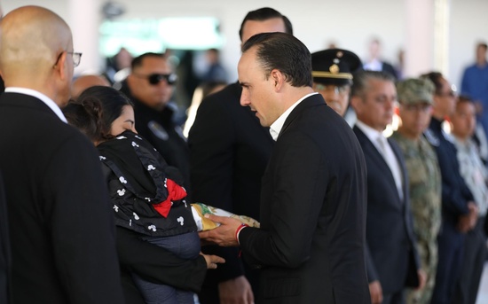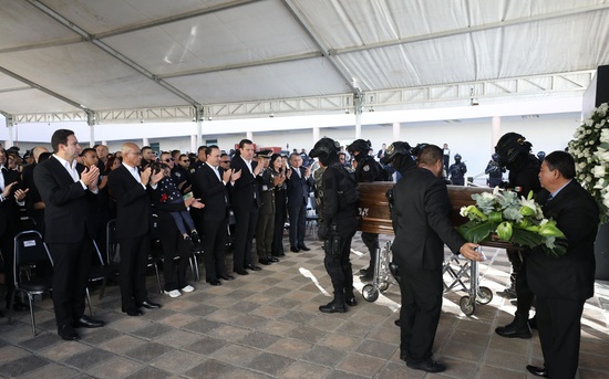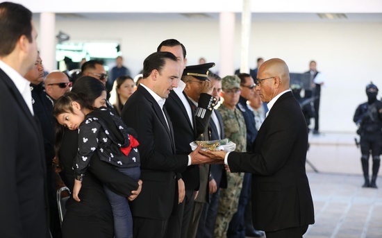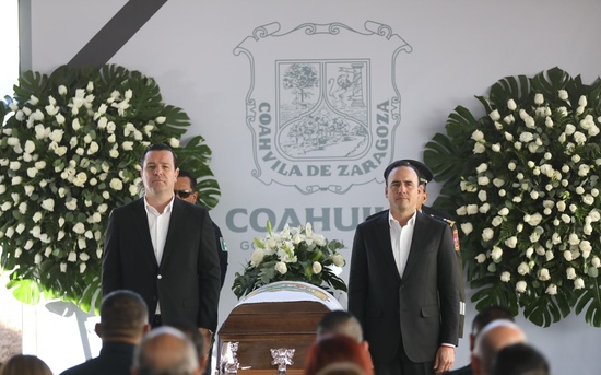 Posteriormente, se llevó a cabo el toque de silencio y salva de honor por parte de la Banda de Guerra del 69º Batallón de Infantería, y el gobernador hizo entrega de la Bandera de Coahuila a la familia del elemento como símbolo de honor y gratitud del pueblo coahuilense.
