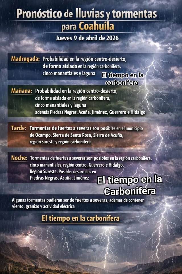 Ciudad Acuña, Coahuila. 08 de abril del 2026.- Desde esta madrugada de jueves 9 de abril de 2026 inicia la probabilidad de precipitación en el estado, donde se pueden además desarrollar lluvias y tormentas sobre todo en la tarde y noche donde se incrementa la posible presencia de tiempo de fuerte a severo.