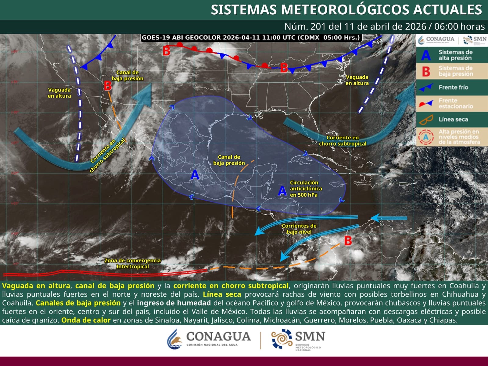 Saltillo, Coahuila de Zaragoza; 11 de abril de 2026.– La Secretaría de Gobierno, a través de la Subsecretaría de Protección Civil del Estado, informa que este día se prevén condiciones de inestabilidad atmosférica en la entidad, derivadas de la interacción de una vaguada en altura sobre el noroeste del país, un canal de baja presión en la Mesa del Norte, una línea seca en el norte de México y la corriente en chorro subtropical.