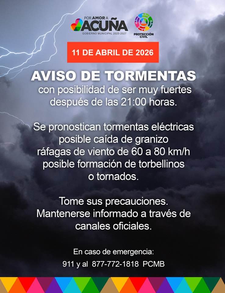 Ciudad Acuña, Coahuila. 11 de abril del 2026.- Informamos que para esta noche, sábado 11 de abril, se prevén tormentas con intensidad fuerte a partir de las 21:00 horas y durante la madrugada.